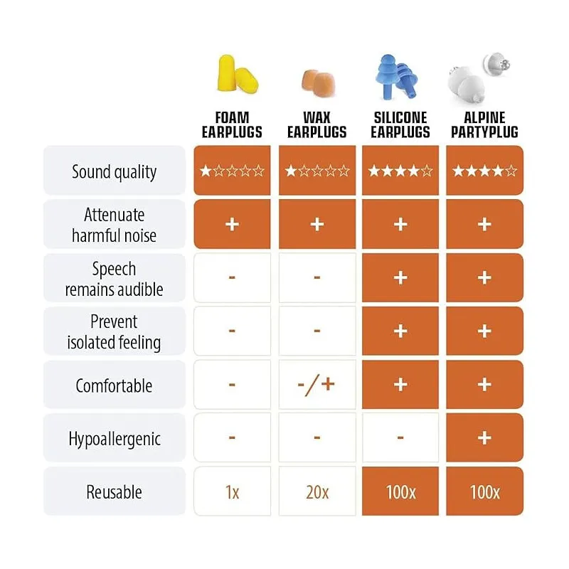 Model Party Plug Pro is the highest quality from Alpine - created with music lovers and musicians in mind. Equipped with AlpineAcousticFilters™ linear filters that provide uniform sound attenuation (average ~21 dB), maintaining the natural timbre of music and the ability to hold conversations even in very noisy environments.