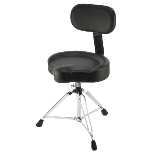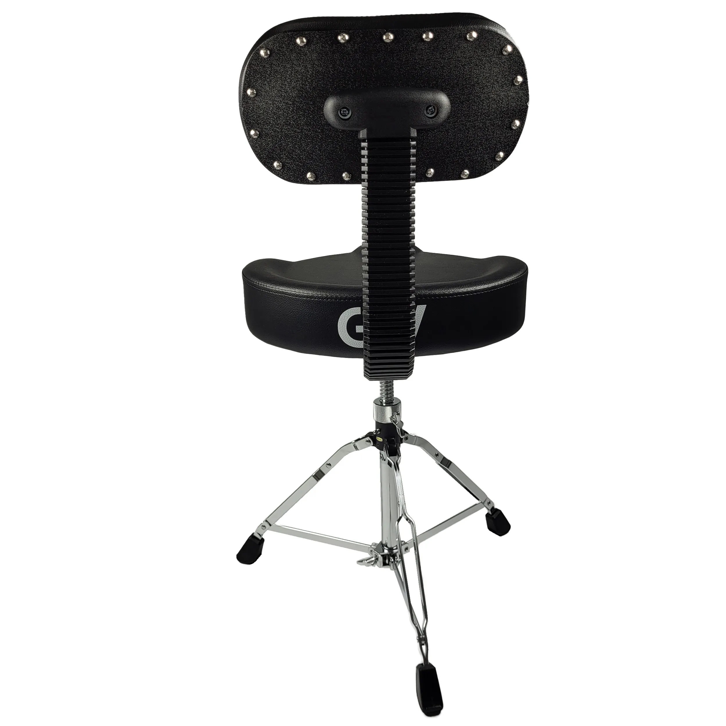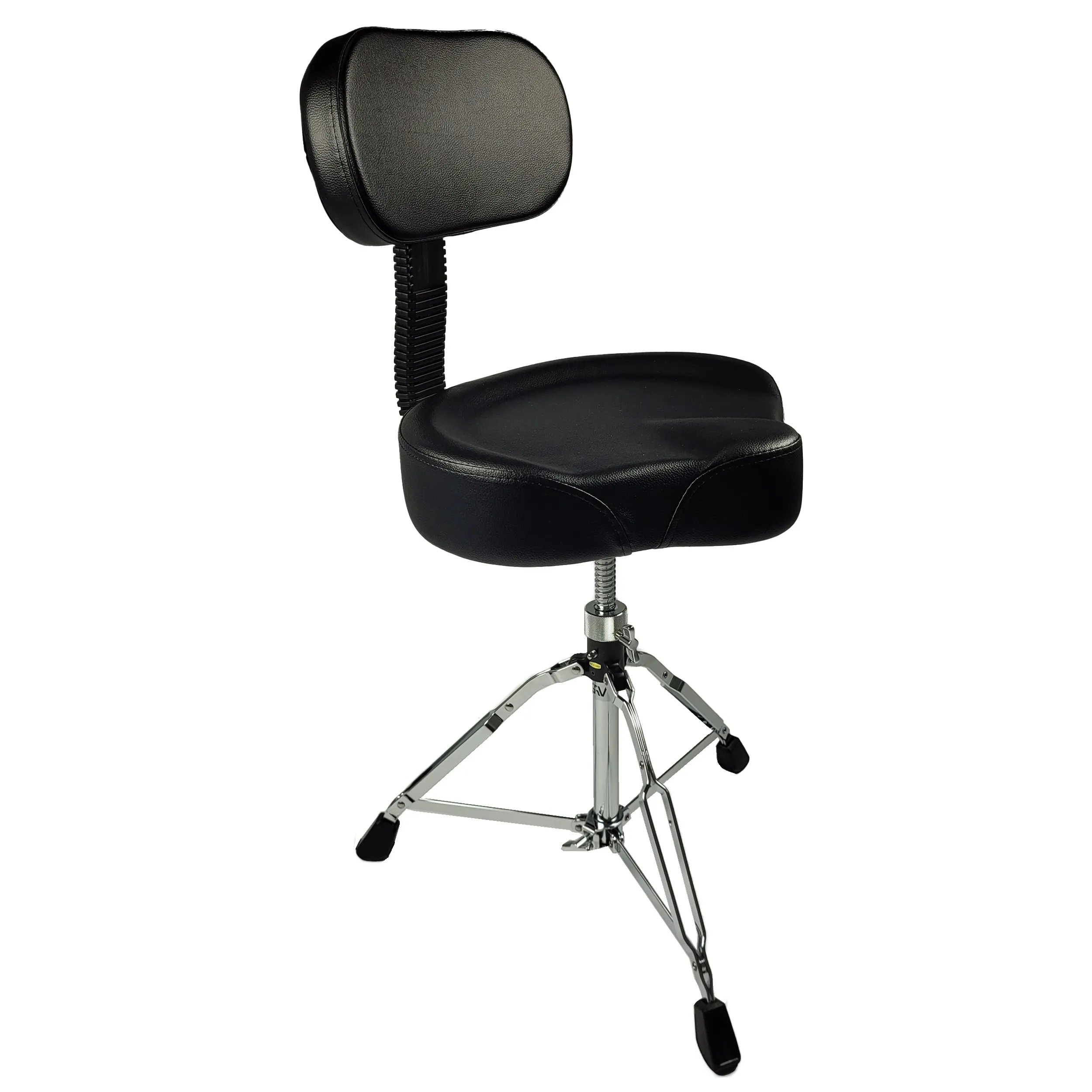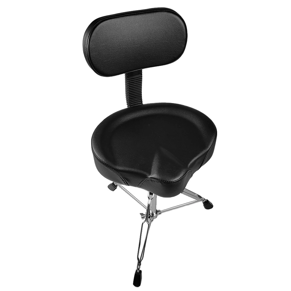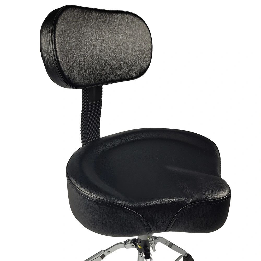 Professional drum stool with a motorcycle seat and backrest , which ensures comfort while playing for a long time. The base consists of three legs that are double reinforced and finished with rubber tips. Legs made of steel. The stool is adjustable in height.