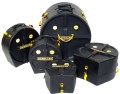 A set of hard cases made of light plastic, equipped with a "quick-lock clips" lock system, adapted for transporting and storing drum toms. The bass drum case has two wheels.