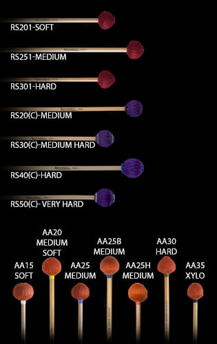 This line of bats was designed for the modern player. The RS201, RS251 and RS301 have mushroom-shaped cores and are tightly wrapped in wire to produce a rich and generally warm tone. The RS20(C), RS30(C) and RS40(C), RS50(C) models are made with large oval cores and are wrapped in synthetic yarn. AA15, AA20, AA25, AA25B, AA25H, AA30 and AA35 are constructed with hard mushroom-shaped rubber cores and are wrapped in multi-layer orange rope. All models are built on durable rattan handles and are hand-tailored for weight, size and sound.