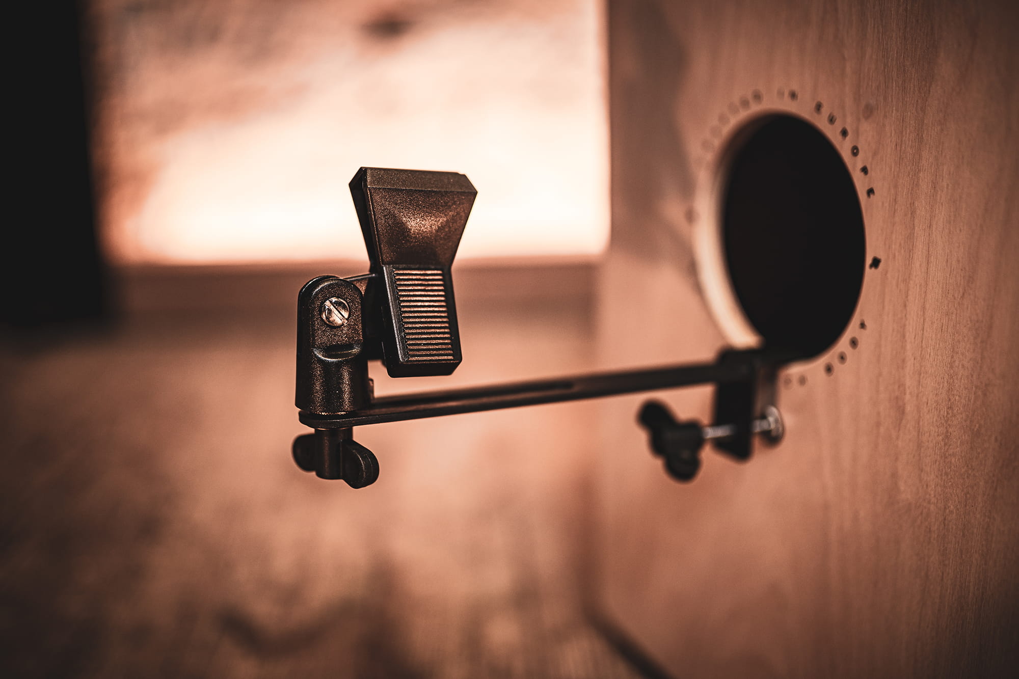 Cajon microphone holder for mounting in the bass hole.