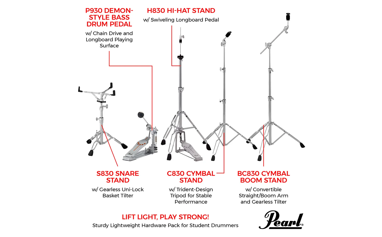 The Pearl HWP830 (830 Series) Hardware Set is a robust yet lightweight stand and kick pedal setup, perfect for beginners and developing drummers alike.