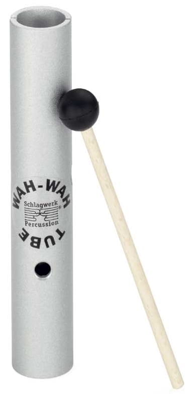 Aluminum tube tuned in the pentatonic scale, 17 cm long. It produces a long-lasting sound with a wah-wah effect by opening and closing the hole. Comes with a baton.