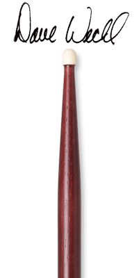 Pair of signature hickory sticks: DAVE WECKL ORIGINAL with a barrel-shaped wood tip. A fast stick providing a broad, full cymbal sound.